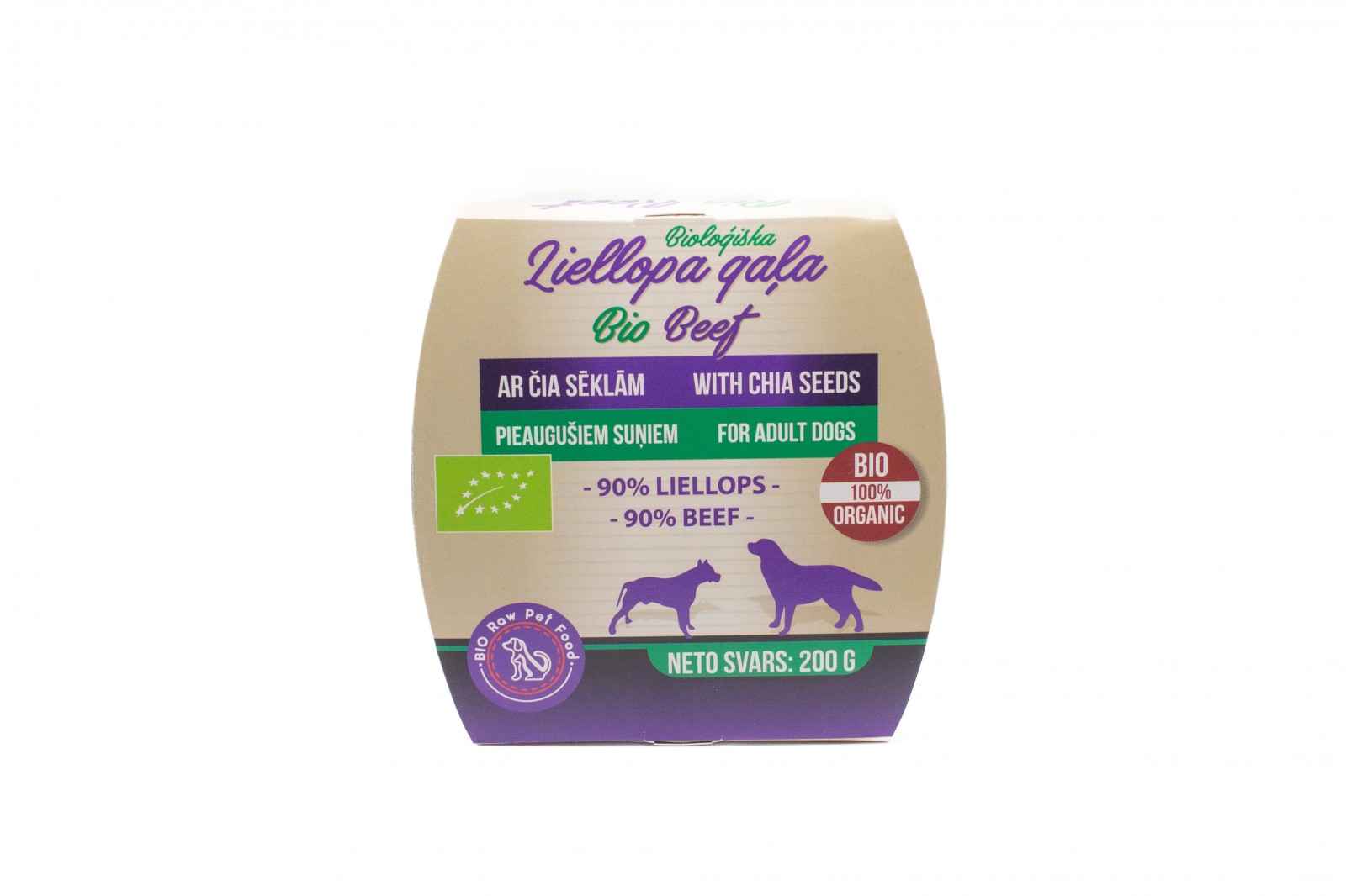 Sastāvs: bioloģisks liellops - 90% (gaļa, sirds, aknas, nieres, plaušas), bulijons, sausseržu ogas, burkāni, mineralvielas, čia sēklas.