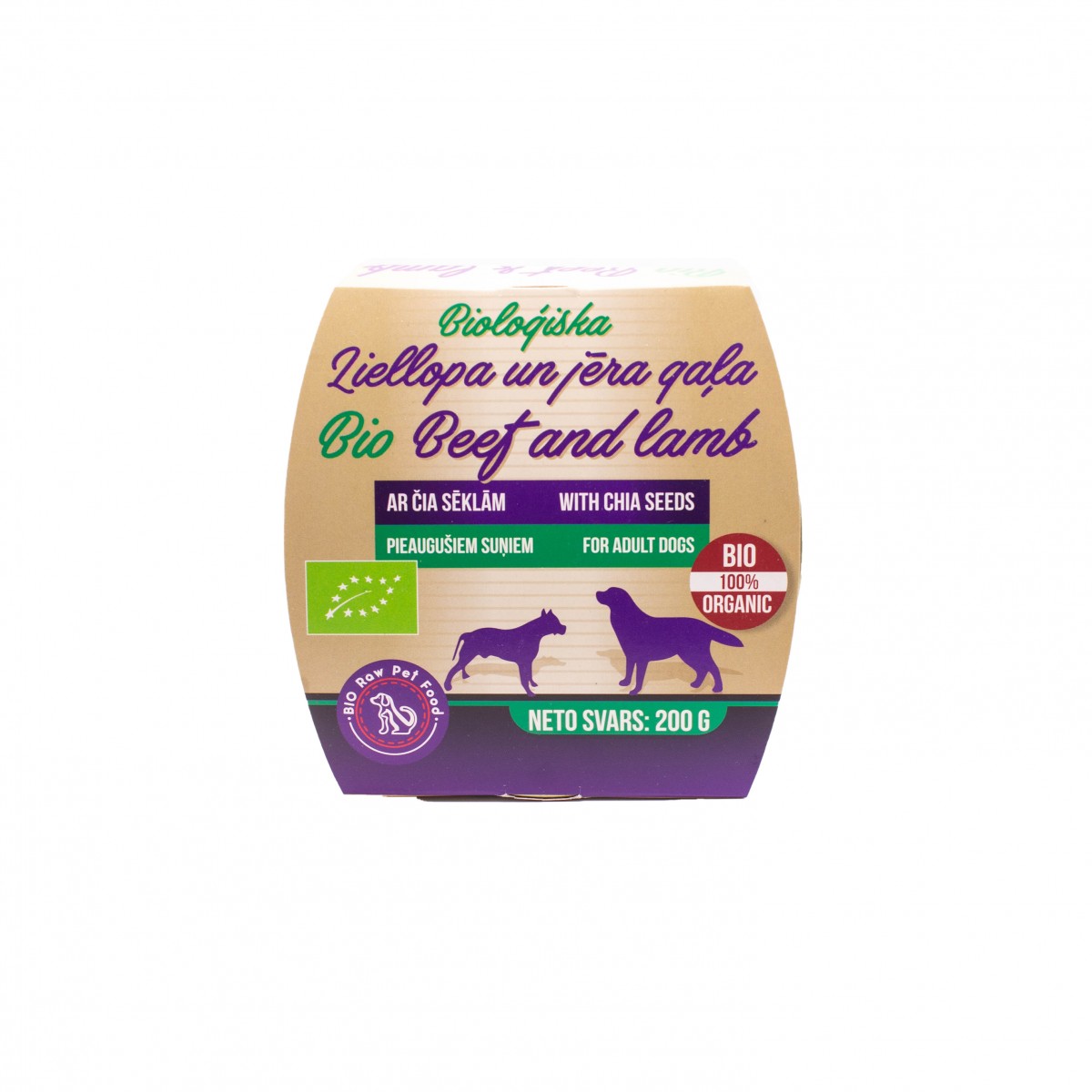 Konservi pieaugušiem suņiem ar bioloģiska liellopa, jēra gaļu un čia sēklām 200g