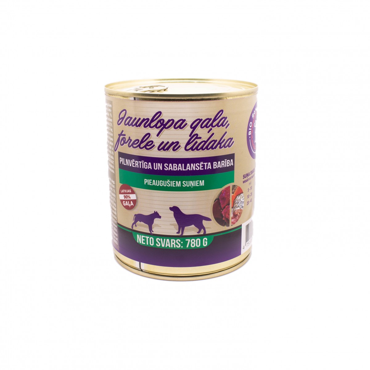 Sastāvs: jaunlops - 70% (gaļa, sirds, nieres, liesa), forele - 10%, līdaka 10%, buljons, sausseržu ogas, burkāni, mineralvielas, čia sēklas.
