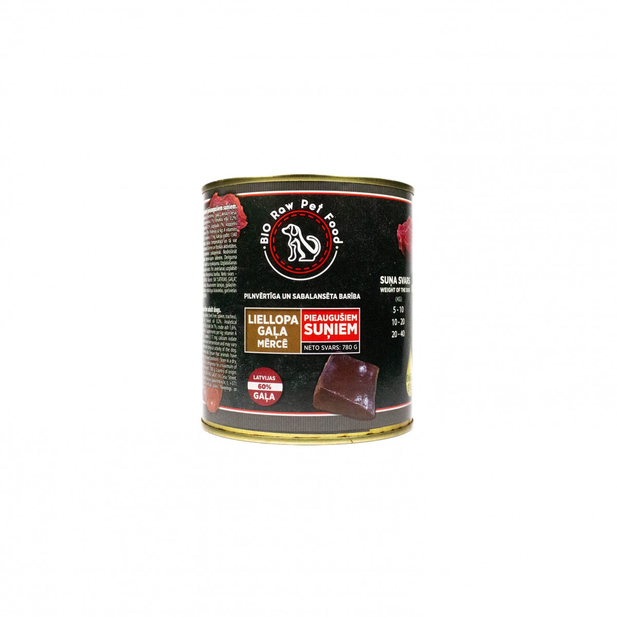 Sastāvs: liellops 60% (plaušas, tesmenis, gaļa, aknas, liesa, traheja ), buljons, mineralvielas, linsēklu eļļa.