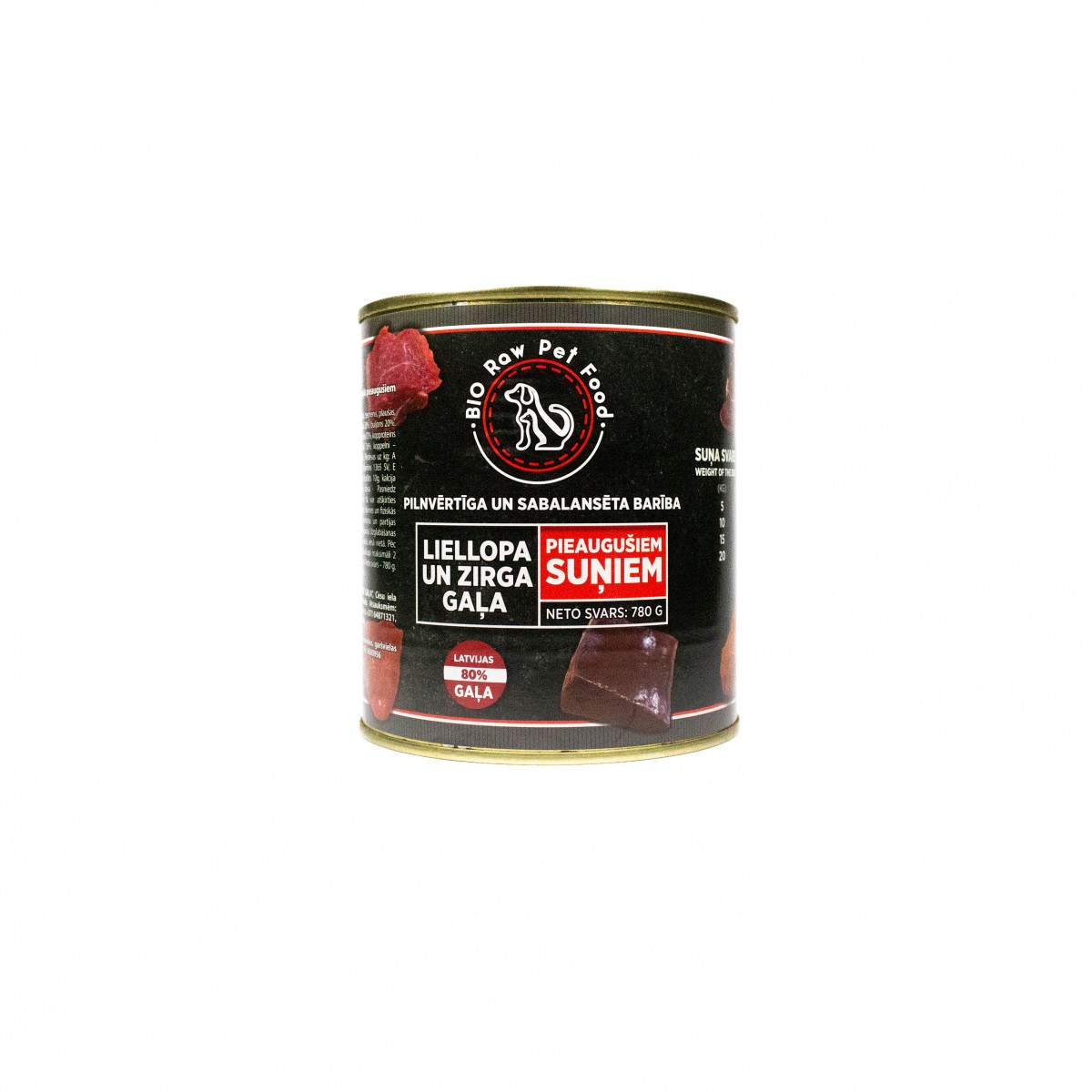Sastāvs: liellops 60% (gaļa, tesmenis, plaušas, aknas, traheja), zirga gaļa 20%, buljons, mineralvielas, linsēklu eļļa.
