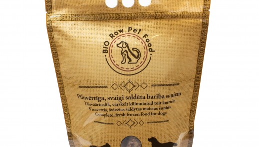 Sastāvs: liellopa gaļa 40%, brētliņas 10%, kuņģis 10%, aknas 10%, tesmenis 10%, sasmalcināti kauli 10%, burkāns 4%, ķirbis 3.9%, saussēržu ogas 1%, brūklenes 1%, čīa sēklas 0.1%.